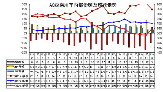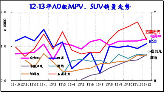 SUV的市場地位快速提升。12年的下半年開始的小型SUV異軍突起,合資品牌和內資品牌均在此強力突破,小型車市場偏向SUV走強。12年12月以來的絢麗轉哈佛m4帶來銷量提升較快, 12年底上市的昂克雷進一步把小型suv 市場做大,3月的翼博新車上市并掀起價格風潮,這對SUV市場的普及化暴增有促進。13年12月的小型SUV占比達到10%,同比增長3個百分點。新品成為推動A0級車的全面延伸的標志性車型,而價格是催化劑。