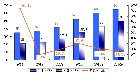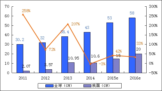 2011-2016年我國(guó)光伏新增裝機(jī)量、增長(zhǎng)率及全球新增裝機(jī)量
