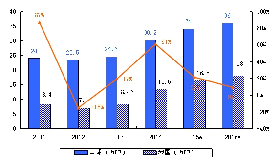 2011-2016年我國(guó)多晶硅產(chǎn)量、增長(zhǎng)率及全球多晶硅產(chǎn)量
