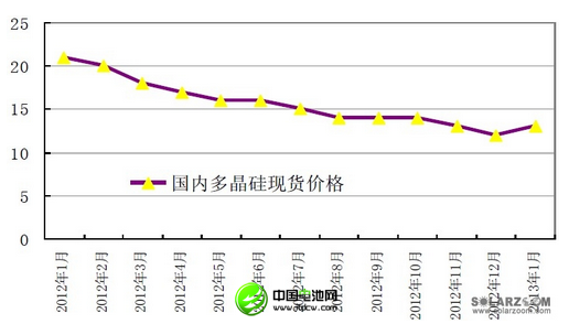 2012年12月底多晶硅價格觸底11.5-12.5萬元/噸,2013年1月初開始多晶硅光伏各類產(chǎn)品價格開始出現(xiàn)止跌反彈的現(xiàn)象,其中單晶產(chǎn)品率先反彈,隨后幾周內(nèi),受需求回暖、下游企業(yè)主動停產(chǎn)及對美韓雙反等幾大因素影響,全產(chǎn)業(yè)鏈價格上漲幅度擴大,硅片、電池片、組件價格全面上漲,業(yè)內(nèi)人士紛紛對2013年需求展望持樂觀態(tài)度,樂觀氛圍提振業(yè)者信心,中下游企業(yè)醞釀?wù){(diào)漲報價,因此2013年多晶硅價格上漲并非空穴來風(fēng)。