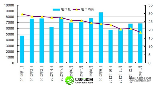 據(jù)最新海關(guān)統(tǒng)計數(shù)據(jù)顯示,2013年1月我國多晶硅進(jìn)口量為6791噸,環(huán)比微幅增長,同比增加12%;進(jìn)口單價方面,1月份多晶硅進(jìn)口均價創(chuàng)歷史新低,大幅下挫至18.47美元/千克,環(huán)比下降11.58%,同比下降41.5%,較2012年全年均價下滑27.17%。