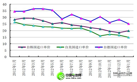 從三大進(jìn)口國進(jìn)口單價來看:2013年1月德國和美國的進(jìn)口單價較2012年12月出現(xiàn)不同程度下滑,分別為24.99美元/千克和14.70美元/千克,而韓國的進(jìn)口單價回升到19.79美元/千克,自美國進(jìn)口多晶硅單價在2013年1月份仍居三國之中最低位并又創(chuàng)歷史新低。