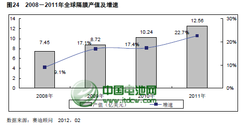 從產值來看,2011年全球鋰離子電池的產值達到12.56億元,同比增幅為22.7%,保持了較快的增長速度。產值增幅低于產量增幅的主要原因是隨著鋰離子電池隔膜的逐步產業化和產量的逐步增加,其單價保持著逐步下降的趨勢,從而導致整個隔膜的市場規模增幅出現一定程度的下降。預計未來整個隔膜的平均單價將繼續保持3-5%的遞減趨勢,但是產量的快速增長仍將帶動全球隔膜的市場規模保持較快的增長趨勢。