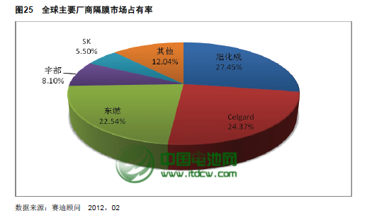 從競爭格局來看,目前世界上只有日本、美國等少數幾個國家擁有鋰離子電池隔膜的生產技術和相應的規?;a業。供貨商以日本旭化成(AsahiKasei)、美國Celgard及已并入Exxon集團的東燃(Exxon-Tonen)三者為主要廠商,再加上日本宇部興產(Ube Industries),前四大廠商總市占率已達82.46%,主要面向三洋、索尼、松下、三星SDI、BYD等大型電池廠商。