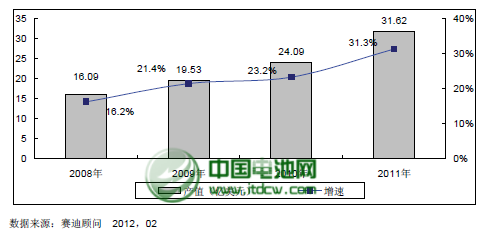 中國范圍來看,作為世界上最大的鋰電池生產制造基地和第二大鋰離子電池生產國和出口國,中國對隔膜的需求日益增加。2007年,中國隔膜的市場規模僅為13.85億元,在中國優良的投資環境和相對低廉的人工成本的作用下,未來幾年鋰離子電池產業在全球范圍內向我國轉移的趨勢將越來越明顯,從而帶動整個隔膜的市場規??焖僭鲩L,2011年中國隔膜產業的市場規模達到31.62億元,同比增長31.62%。