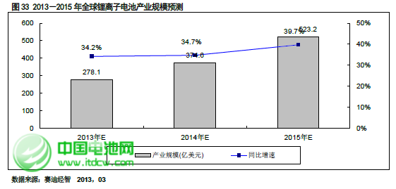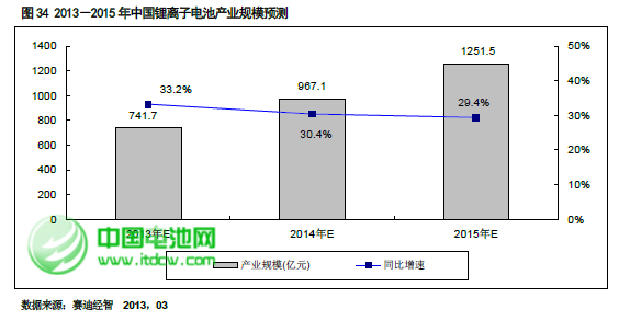 就中國市場而言,得益于動力鋰離子電池的快速發(fā)展,2013 年鋰離子電池整體市場規(guī)模將達(dá)到741.7 億元,同比增長33.2%,并且未來三年市場規(guī)模增速均會保持在30%以上,到2015 年整個中國鋰離子電池的市場規(guī)模將突破1000 億元,達(dá)到1251.5 億元。