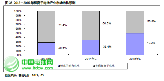 從鋰離子電池市場結(jié)構(gòu)來看,賽迪顧問認(rèn)為鋰離子市場規(guī)模未來三年內(nèi)增長的動力來自于以新能源汽車電池為代表的動力電池。到2015 年鋰離子動力電池市場規(guī)模占比將達(dá)到49.2%。