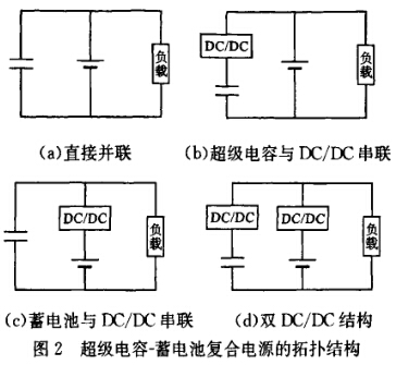 超級電容與蓄電池、燃料電池等配合可以組成復合電源系統,但燃料電池因為成本較高,現在還不能得到實際應用。因此,國內外對超級電容一蓄電池復合電源系統的研究更多,其拓撲結構概括如圖2所示。圖2a結構最簡單,但由于沒有DC/DC變換器,蓄電池和超級電容將具有相同的電壓,以致超級電容僅在蓄電池電壓發生快速變化時輸出和接收功率,從而減弱了超級電容的負載均衡作用。圖2b與圖2c都采用了雙向OC/OC變換器,圖2b中雙向DC/DC跟蹤檢測蓄電池的端電壓,以調控超級電容的端電壓使兩者匹配工作。由于蓄電池端電壓的變化比超級電容的端電壓平緩,因此對于DC/DC,圖2b比圖2c易于控制。圖2d理論上雖然具有更高的靈活性,但對DC/DC的控制策略要求非常精確復雜且不易維護。
