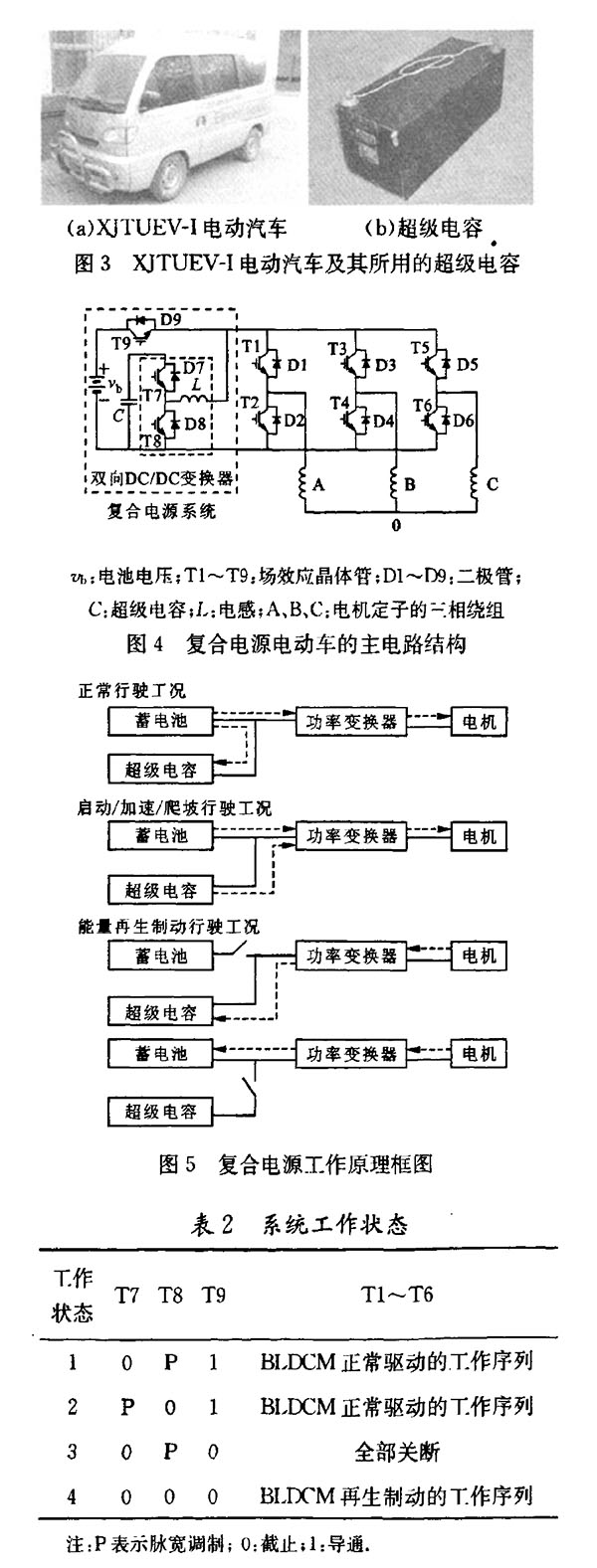 西安交通大學電動車研發中心還依托西安交大科技園和博源電動車技術有限責任公司合作進行了超級電容一蓄電池復合電源微型電動車的研究。該微型電動車采用輪轂式無刷直流電機(BLDCM),運用再生制動能量回收技術,并應用了μ綜合魯棒控制算法。實驗證明,采用上述技術的微型電動車比普通電動車在動力性能和續駛里程上都有顯著提高,尤其是在頻繁剎車和突然加速的工況下,效果提高更明顯。設計的復合電源微型電動車控制系統的主電路如圖4所示,工作原理如圖5所示,系統工作狀態如表2所示。該復合電源微型電動車具有如下優點:①在車輛制動和減速時可大電流充電,從而提高能量回收效率,延長電動車的續駛里程;②超級電容的功率密度較大,因此可大電流放電,改善電動車的啟動、加速、爬坡性能;③可避免蓄電池大電流充放電,提高蓄電池的使用壽命;④可提高制動力矩,改善制動系統的可靠性;⑤回收時可先對超級電容充電,再對電池充電,所以可控性較好;⑥結構緊湊,成本較萬方數據