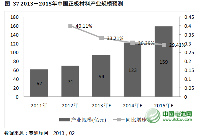 就中國產(chǎn)業(yè)而言,得益于動力鋰離子電池的快速發(fā)展,2013年正極材料產(chǎn)業(yè)整體產(chǎn)業(yè)規(guī)模將達(dá)到94億元,同比增長33.2%,并且未來三年市場規(guī)模增速均會保持在30%以上,到2015年整個中國正極材料產(chǎn)業(yè)的市場規(guī)模將達(dá)到159億元。
