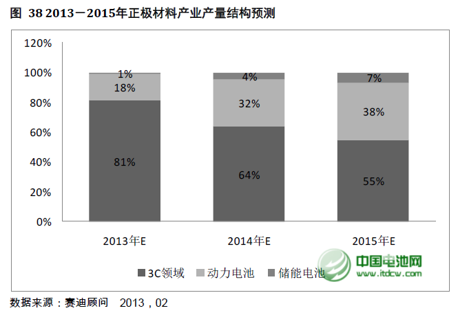 從鋰離子電池市場結(jié)構(gòu)來看,中國電池網(wǎng)-中國電池雜志戰(zhàn)略合作機構(gòu)——賽迪顧問認(rèn)為正極材料規(guī)模未來三年內(nèi)增長的動力來自于以新能源汽車電池為代表的動力電池。到2015年鋰離子動力電池市場規(guī)模占比將達(dá)到38%。