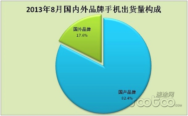 2013年8月份,國產(chǎn)手機(jī)品牌出貨量4186.8萬部,同比增長19.1%,環(huán)比下降8.5%,占手機(jī)總出貨量的82.4%。國外手機(jī)品牌出貨量占總出貨量的17.6%。我國國內(nèi)手機(jī)生產(chǎn)商有數(shù)千家,以中低端產(chǎn)品為主,在出貨量上比較大,沒有政策和環(huán)境限制。而國外品牌出貨量則遠(yuǎn)遠(yuǎn)少于國內(nèi)品牌,主要原因在于國外品牌在國內(nèi)以走高端市場為主,在出貨量上不以量產(chǎn)生利潤,如蘋果、三星等手機(jī)廠商。對于國產(chǎn)品牌來講,如何深化自己的品質(zhì),提高產(chǎn)品的利潤而不是以量決定利潤和市場將會是我國絕大多是手機(jī)廠商所要解決的問題。