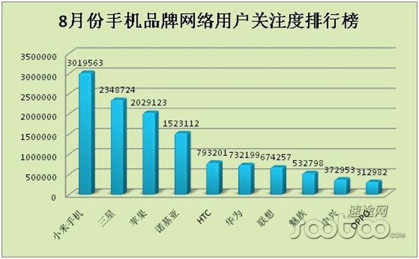 小米手機(jī)網(wǎng)絡(luò)搜索排名第一位,8月網(wǎng)民搜索度超300萬