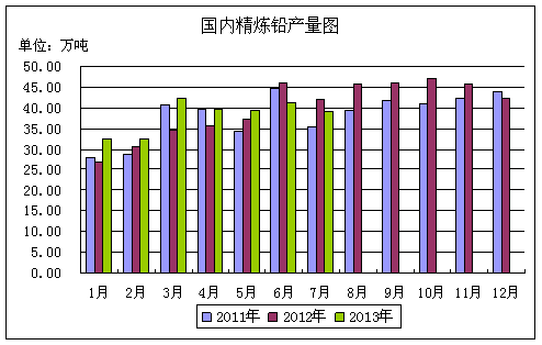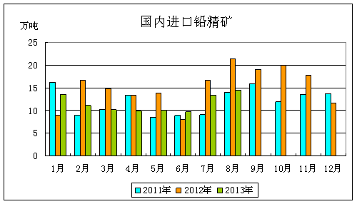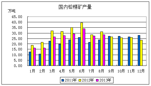 國(guó)家統(tǒng)計(jì)局?jǐn)?shù)據(jù)顯示,2013年1-8月份我國(guó)鉛精礦產(chǎn)量為201.61萬(wàn)噸,同比下降4.64%,其中8月份產(chǎn)量為28.43萬(wàn)噸,同比下降8.94%。
