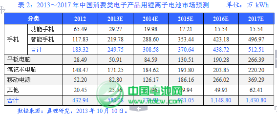 2012年中國智能手機市場上國產品牌已占據2/3的市場份額,2013年市場份額會更高;同時,全球的智能手機市場,中國企業的市場份額也將會首次超過50%。這對于中國的鋰離子電池產業是非常有利的。不過,在2014年中國手機市場智能手機基本完成對功能手機的替代之后,其銷量增長速度將會放緩,這個時候消費者更關注智能手機的性能體驗,因此,單位手機鎖配備的鋰離子電池容量將會有明顯增長。基于這些判斷,真鋰研究預測到2017年中國手機市場將消耗512.51萬kWh的鋰離子電池,是2012年的2.8倍。
