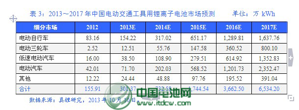 在電動(dòng)自行車(chē)市場(chǎng),鋰離子電池正在規(guī)模化取代鉛酸電池。真鋰研究預(yù)計(jì),無(wú)論是全球還是中國(guó),今后幾年該市場(chǎng)的鋰離子電池用量將會(huì)以90%~100%的年增速成長(zhǎng),到2016年基本完成替代鉛酸電池的過(guò)程。全球電動(dòng)自行車(chē)產(chǎn)能90%以上集中在中國(guó),這一狀況即使未來(lái)多年內(nèi)也很難改變。預(yù)計(jì)到2017年中國(guó)電動(dòng)自行車(chē)對(duì)鋰離子電池的需求量將高達(dá)1,637.76萬(wàn)kWh,是2012年的19.69倍;不過(guò),其占整個(gè)中國(guó)電動(dòng)交通工具用鋰離子電池需求總量的比重將降到25.06%。