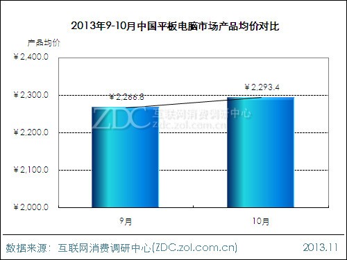 10月平板電腦市場上,ZDC統計數據顯示,整體市場均價為2293.4元看,較9月上升26.6元,漲幅1.2%。本月共有24款產品降價,占產品總數的3.9%。從產品均價變化看,本月整體市場并沒有受到黃金周的沖擊,市場均價相對保持穩定。