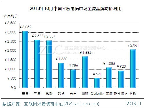 2013年10月中國平板電腦市場上,整體市場產品均價保持穩定,主流品牌中蘋果產品均價相對較高,三星與微軟基本持平。細分市場上,國產品牌產品均價較9月下降5.3%,反映出本月國產平板電腦產品價格變化幅度較大。產品參數方面,Android系統平板電腦占據價格優勢。