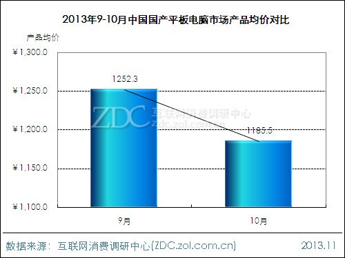 ZDC統計數據顯示,10月國產平板電腦市場產品均價出現下滑,由9月的1252.3元下滑至10月的1185.5元,降幅為5.3%。從國產市場產品均價變化來看,本月國產平板電腦在十一假期的促銷力度較大。