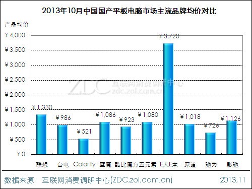 10月平板電腦市場上,國產品牌中,高端商務品牌E人E本以接近4000元的產品均價高居各主流品牌首位,聯想與藍魔分別排在第二、三位,產品均價為1330元和1086元。整體來看,國產品牌平板電腦主要以千元機為主。