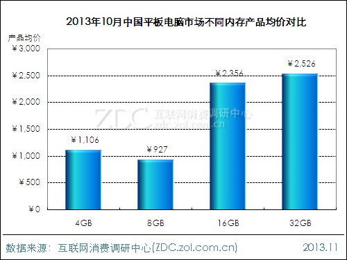 10月平板電腦市場上,ZDC統計數據顯示,內存容量為32GB和16GB的平板電腦產品均價都在2000元以上。與前兩者相比,4GB與8GB內存產品價格相對較低,其中8GB內存平板電腦產品均價不足1000元。