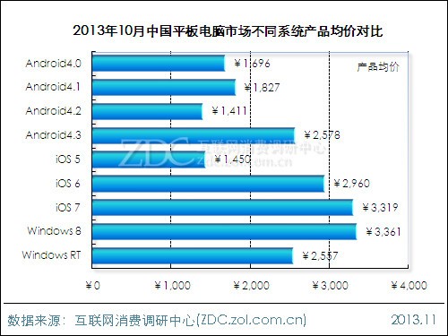 從產品所采用的操作系統來看,10月搭載iOS7和Windows8系統的平板電腦產品均價基本持平,分別為3319元和3361元。Android4.2與iOS5產品均價相對較低,都處于1500以下。整理來看,Android系統產品均價相對較低,而Windows與iOS系統產品則以高端產品為主。
