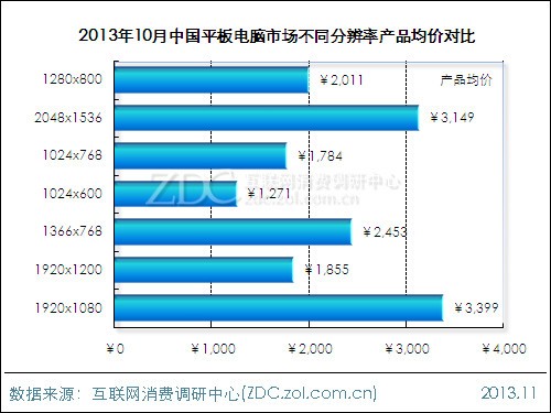 10月平板電腦市場上,ZDC統計數據顯示,分辨率為1920x1080和2048x1536的平板電腦產品均價都在3000元以上,其中1920x1080產品均價相對最高。整體來看,平板電腦市場上高分辨率產品都伴隨著高價位,因此如果對于視覺感受沒有過高要求的用戶來說,1024x768分辨率產品會是一個折中的選擇。