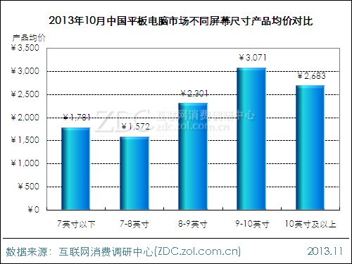 ZDC統計數據顯示,10月屏幕尺寸在7-8英寸之間的平板電腦產品均價為1572元,與其它屏幕尺寸產品相比,更適合大眾消費者。與之相比,9英寸以上平板電腦產品均價都在2500元以上,產品多以高端機型為主。