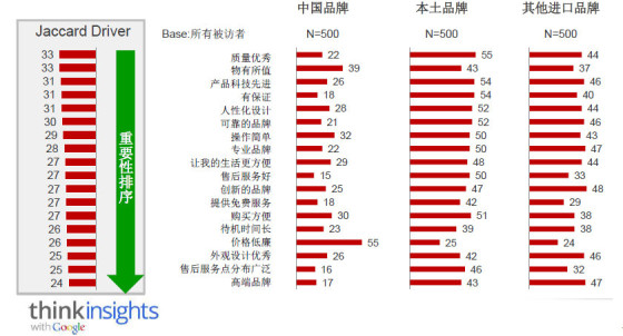 最后就是我們 國(guó)內(nèi)企業(yè)一直在說的品牌,在與品牌相關(guān)的“專業(yè)品牌”、“創(chuàng)新的品牌”、“高端品牌”的選項(xiàng)中,我們的得分最低。我們的企業(yè)會(huì)說正是因?yàn)槲覀兊钠放浦?不高,所以不得不以價(jià)格作為惟一競(jìng)爭(zhēng)和立足的手段。但我們想說的是,我們的企業(yè)把這種導(dǎo)致品牌知名度不高的邏輯關(guān)系弄顛倒了。恰是因?yàn)樯鲜鑫覀兊哪切┰?才導(dǎo)致這最終落實(shí)到品牌的結(jié)果。這無非在提醒我們的企業(yè),知名的品牌不是靠宣傳和營(yíng)銷就能得到的,其背后需要的是創(chuàng)新及優(yōu)秀產(chǎn)品的支撐。