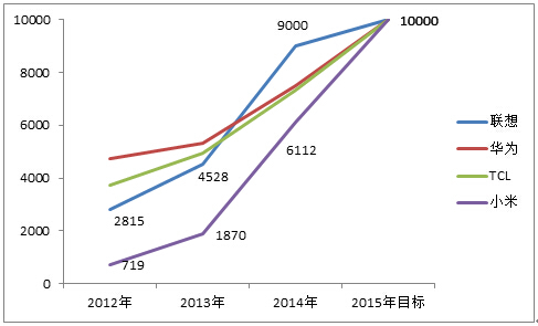 2015年是個關鍵節(jié)點,這一年將有幾家國產(chǎn)手機廠商的年銷量超過1億部。曾對外表態(tài)2015年目標是超1億部的廠商有5家。中興三年前年銷量已經(jīng)近7000萬部,三年目標中提過,但歷經(jīng)虧損轉(zhuǎn)型,目前看不現(xiàn)實。而且中興終端事業(yè)部CEO曾學忠曾明確表示,2015年中興智能手機銷量目標是6000萬部,按當前手機市場智能機占比90%倒推,2015年中興全部手機銷量目標在6600-7000萬部。剩下的四家分別是聯(lián)想、華為、TCL、小米,我們來逐一分析一下。