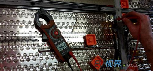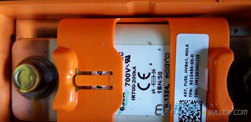 5.單個(gè)電池模塊俯瞰圖 6.將電壓表接上主觸點(diǎn)的hot side部分,即可讀取整個(gè)電池組的電壓——313.8V。 7. 單個(gè)電池模塊電壓196.3V 8. 近距離觀察電池組的主保險(xiǎn)