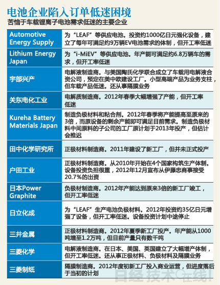 比如,為LEAF配備的鋰離子電池供應負極材料的日立化成。2011年7月,該公司宣布投資約35億日元,在山崎事業所(茨城縣常陸那珂市)增設第3生產線和第4生產線,以實現產能翻倍。第3生產線雖于2012年冬季投產,但開工率低迷。“第4生產線暫時不會開工”(日立化成)。