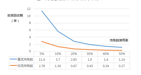 分析充電樁項目的投資與運營情況可以發現,充電樁的投資回收期與充電樁的使用率關系密切。對于交流慢充樁來說,使用率為5%的情況下,回收期需要近3年,若提升使用率到30%(每天充電8小時),則投資回收期被縮短到半年以內。這個情況對于直流快充樁表現更為明顯,在使用率為5%和30%的情況下,投資回收期分別為12年和2年。提升充電樁使用率將大幅度縮短充電樁的投資回收期。