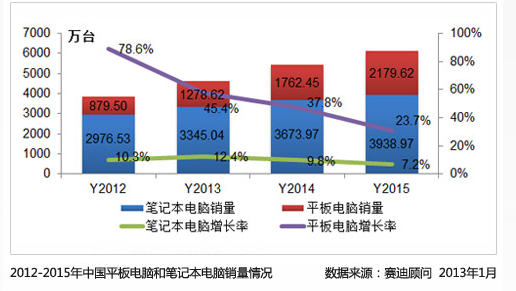 近日,賽迪顧問發布報告稱,2012年中國平板電腦銷量達879.50萬臺,增長786%,中低端產品銷售快速增長和行業應用深入是市場增長的主要推動力;筆記本電腦銷量達2976.53萬臺,增長10.3%,增速較2011年下滑17.4個百分點。