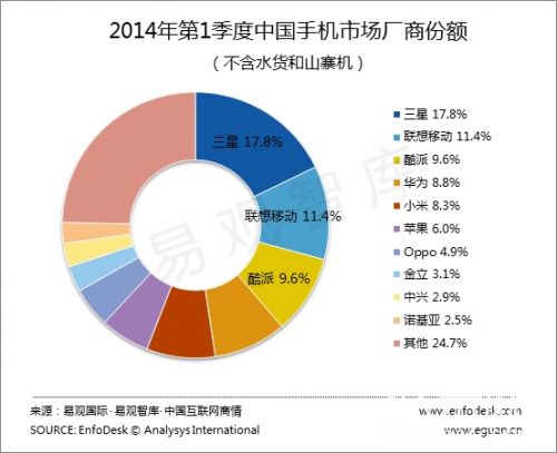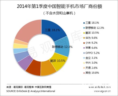 根據(jù)EnfoDesk易觀(guān)智庫(kù)的《中國(guó)手機(jī)市場(chǎng)季度監(jiān)測(cè)報(bào)告2014年第1季度》顯示,第1季度無(wú)論從普通手機(jī)還是智能手機(jī)市場(chǎng)廠(chǎng)商份額上來(lái)講,華為均略勝小米一籌。