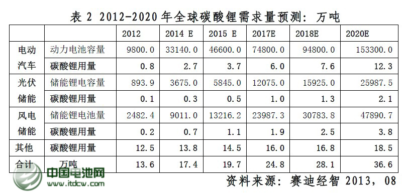 從電動汽車來看,預計2015年和2020年全球的電動汽車的產量分別為430萬輛和1100萬輛,而其中包含EV、PHEV和HEV,其動力電池單位容量平均分別為50Kwh、10Kwh和2Kwh,2015年和2020年分別為動力電池帶來46Gwh和153Gwh的市場空間,按照0.8KG/Mwh的碳酸鋰用量,其將為碳酸鋰創造3.7萬噸和12.3萬噸的市場需求量。