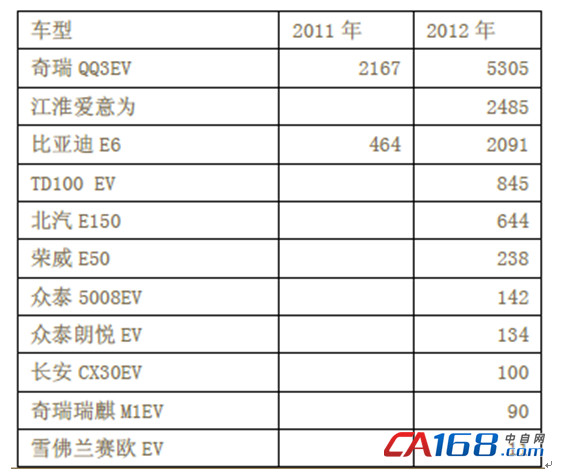 根據(jù)汽車工業(yè)協(xié)會的數(shù)據(jù),2012年我國新能源汽車生產(chǎn)了12552輛,其中純電動汽車11375輛,插電式混合動力汽車1311輛。銷售新能源汽車12791輛,其中純電動汽車11375輛,純電動汽車產(chǎn)銷量分別比2011年增長98.8%和103.9%。