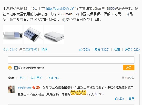 中國電池雜志-中國電池網12月4日訊(肖何 丁丁 北京報道) “小米雷軍賣移動電源了!”昨晚9點,小米科技創始人雷軍發布微博稱,“小米移動電源12月10日上市,內置四節LG/三星18650鋰離子電芯,每節2600mAh;中國人保承保,保額50萬元;品質、做工及容量,歡迎大家拆機評測,這個容量可以帶上飛機。現在搶購價格69元!”微博一出立即引來網友圍觀,從數萬條評論可以看出普通網友借機吐槽小米手機問題者多——“連69元的移動電源都預約,真是奇葩!”而中國電池網4日上午電話連線電池和移動電源業內人士稱,賠錢賺吆喝,并對小米移動電源的電池容量和價格提出質疑。