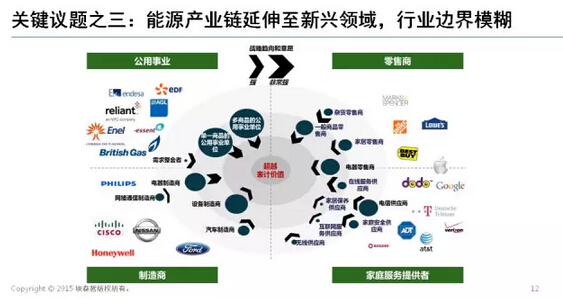 傳統(tǒng)的能源行業(yè)和新興產(chǎn)業(yè)互相滲透,共同角逐能源服務(wù)市場(chǎng)。例如,超市會(huì)進(jìn)入能源零售領(lǐng)域;電信供應(yīng)商、家電家居制造商和零售商,也會(huì)利用智能家居的產(chǎn)品和服務(wù)進(jìn)入能源服務(wù)領(lǐng)域;此外,高科技企業(yè)也在圍繞能源互聯(lián)網(wǎng)提供解決方案,甚至使電動(dòng)汽車(chē)也成為移動(dòng)儲(chǔ)能裝置。