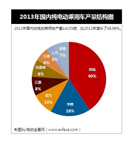 2013年我國國內純電動乘用車產量14235輛,比2012年增長了48.98%。其中奇瑞汽車有限公司產量最多有5767輛,占比達到總產量的40%,排在第二的是上海華普汽車有限公司,產量為2511輛,占比18%。 產