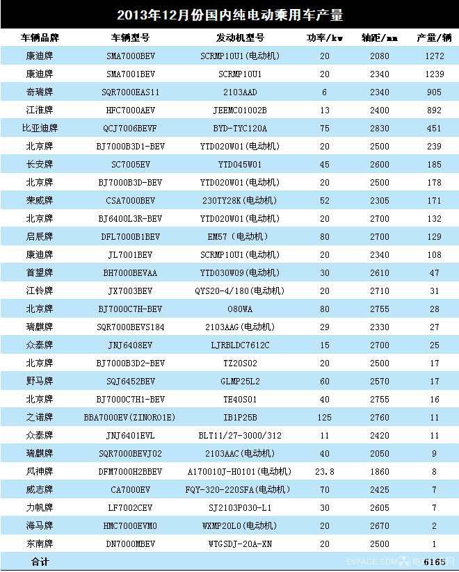 2013年12月份我國純電動乘用車產量有了一個爆發式的增長,據統計,12月份國內純電動乘用車產量達6165輛,相比較11月份的1278輛,環比增長382.3%以上。
