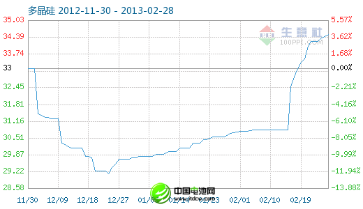 2月27日多晶硅商品指數為34.50,較昨日上升了0.06點,較周期內最高點100.00點(2011-09-08)下降了65.50%,較2012年12月24日最低點29.12點上漲了18.48%。(注:周期指2011-09-01至今)