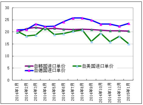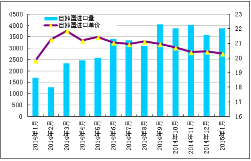 2015年1月份從韓國進口多晶硅量增加至3867噸,環(huán)比增幅為7.7%;1月份進口單價微幅下降至20.31美元/千克,環(huán)比降幅為0.78%。