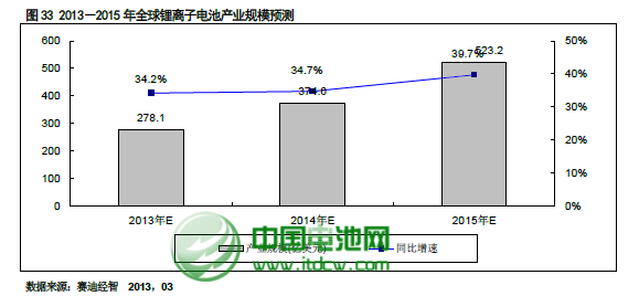預(yù)計(jì)到2013 年全球鋰離子電池產(chǎn)業(yè)規(guī)模將達(dá)到278.1 億美元,2015 年,新能源汽車(chē)的產(chǎn)業(yè)化應(yīng)用將帶動(dòng)全球鋰離子電池的產(chǎn)業(yè)規(guī)模達(dá)到523.2 億美元。