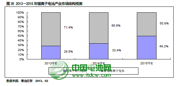 從鋰離子電池市場(chǎng)結(jié)構(gòu)來(lái)看,我們認(rèn)為鋰離子市場(chǎng)規(guī)模未來(lái)三年內(nèi)增長(zhǎng)的動(dòng)力來(lái)自于以新能源汽車(chē)電池為代表的動(dòng)力電池。到2015 年鋰離子動(dòng)力電池市場(chǎng)規(guī)模占比將達(dá)到49.2%。