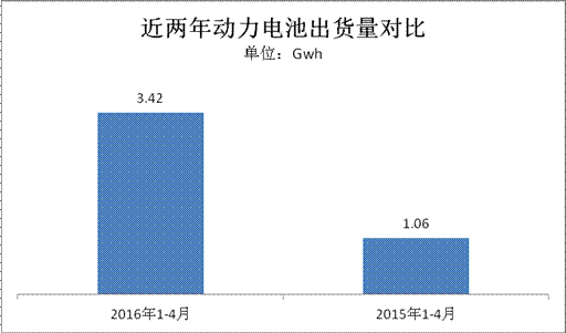 源于政策紅利的引導輔以私人消費信心的培育以及充電基礎設施等多方面的發展,新能源汽車市場也逐步走向穩增長。據中汽協數據統計,2016年1-4月新能源汽車產量94442輛,比上年同期增長126.8%。而作為核心零部件的動力電池也跟隨新能源汽車整體市場走向,呈現高增長趨勢。據第一電動研究院數據梳理,2016年1-4月動力電池出貨量達3.42Gwh,較之去年同期1.06wh的出貨量實現同比增長2.38倍。(注釋:以下動力電池數據源于新能源汽車產量與其搭載的電池容量乘積。由于未考慮其他影響因素,總體實際產能會略高于此。電池出貨量計算公式:車型搭載電池容量*車型產量。