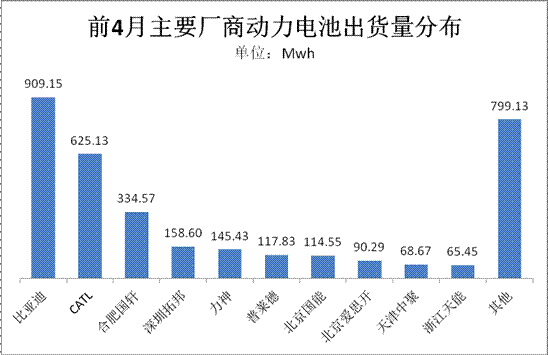 細分動力電池生產廠商看,前4月電池有產量的廠商數量近90家,其中排名前10位的廠商電池出貨量累計達2.63Gwh,占比高達77%;而出貨量超過100Mwh的廠商數量僅7家:比亞迪、CATL、國軒高科、深圳拓邦、力神、普萊德、國能,7家電池出貨量累計達2.4Gwh,占比70%。