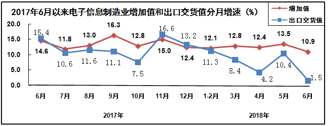上半年,規模以上電子信息制造業實現出口交貨值同比增長6.1%,增速同比回落7.3個百分點;6月份,電子信息制造業出口交貨值僅增長1.5%。