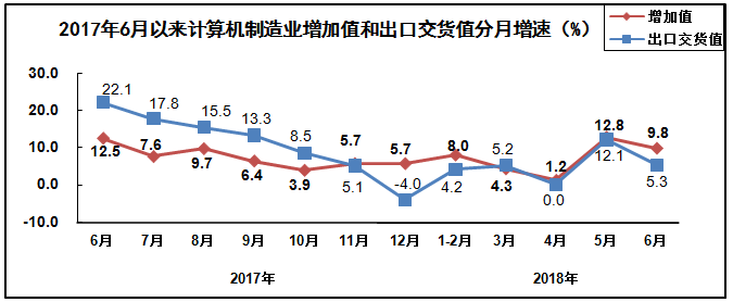 上半年,計算機制造業增加值同比增長7.6%。出口交貨值同比增長5.6%。主要產品中,微型計算機設備產量同比增長0.5%,其中筆記本電腦產量同比增長1.7%;平板電腦產量同比下降3.2%。