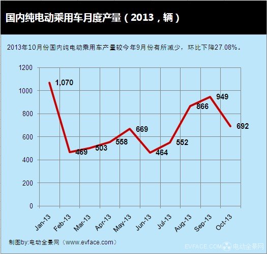 2013年10月份國內(nèi)純電動乘用車產(chǎn)量692輛,較今年9月份產(chǎn)量有所減少,環(huán)比下降27.08%,與去年10月份相比,同比下降40.41%。